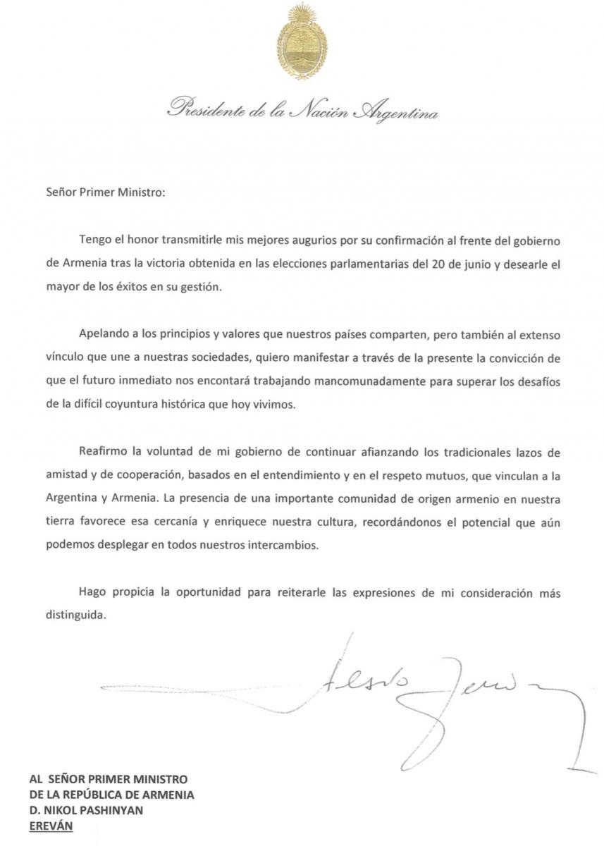 Carta del Sr. Presidente de la Nación al Primer Ministro de la República Armenia en ocasión de su nombramiento
